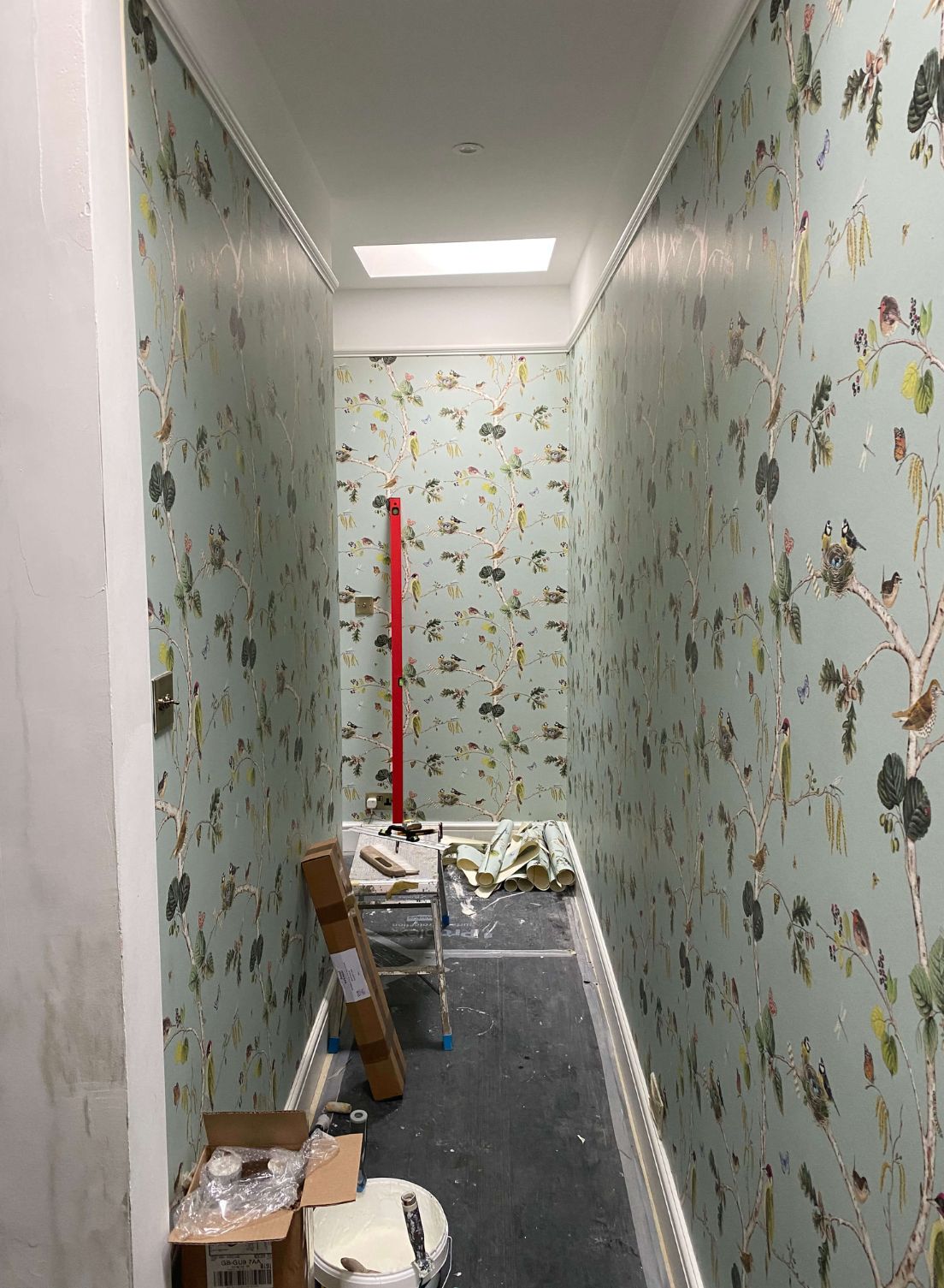 - Specialist wallpaper installation across staircases, bathrooms, and living spaces